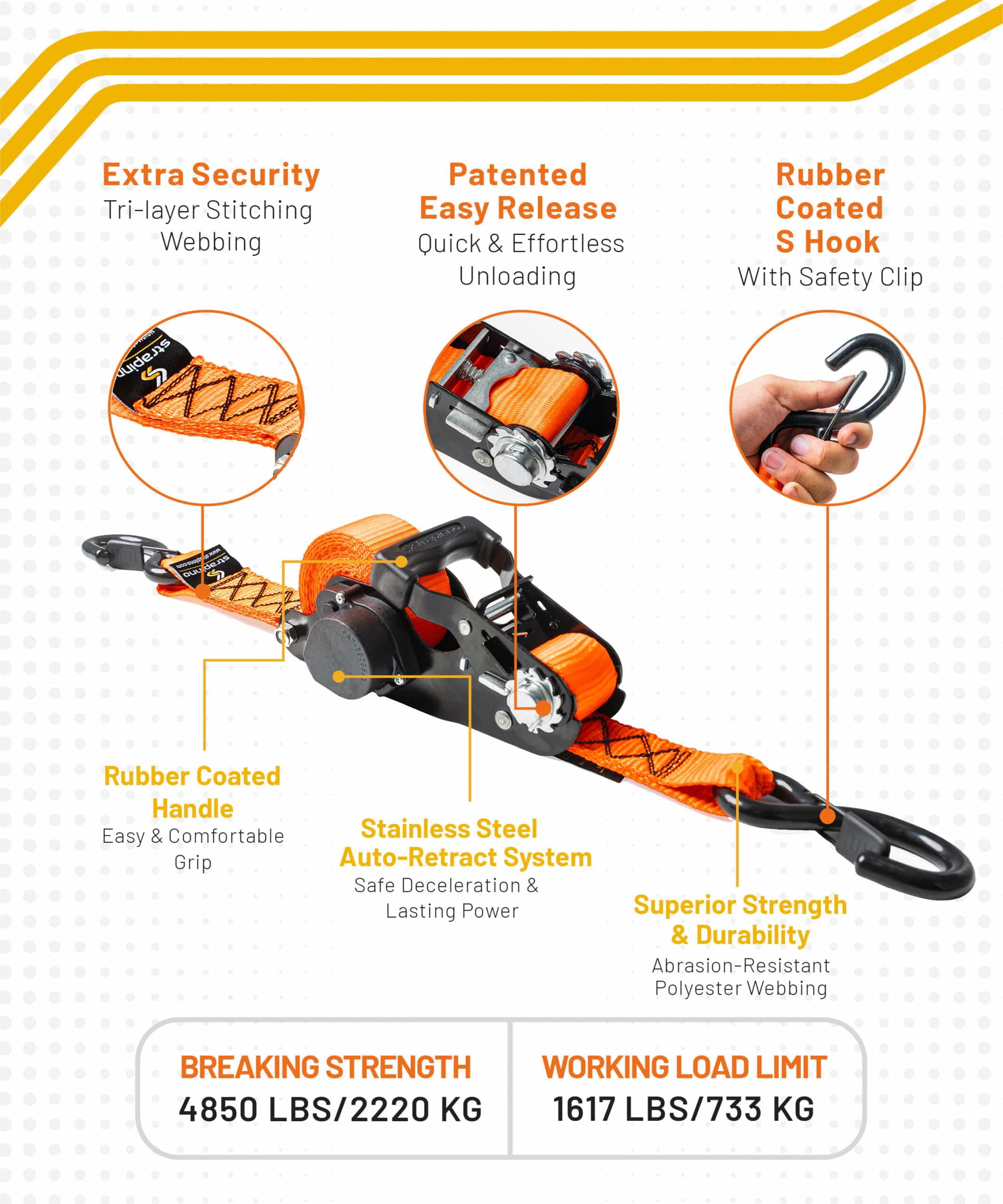 Strapinno’s heavy-duty retractable ratchet straps feature a stainless steel auto-retract system with patented safe deceleration, ensuring smooth, controlled retraction. No snapback, no hassle. With an easy-release design, secure S-hooks, and soft loops, your load stays steady, safe, and ready for the next adventure.