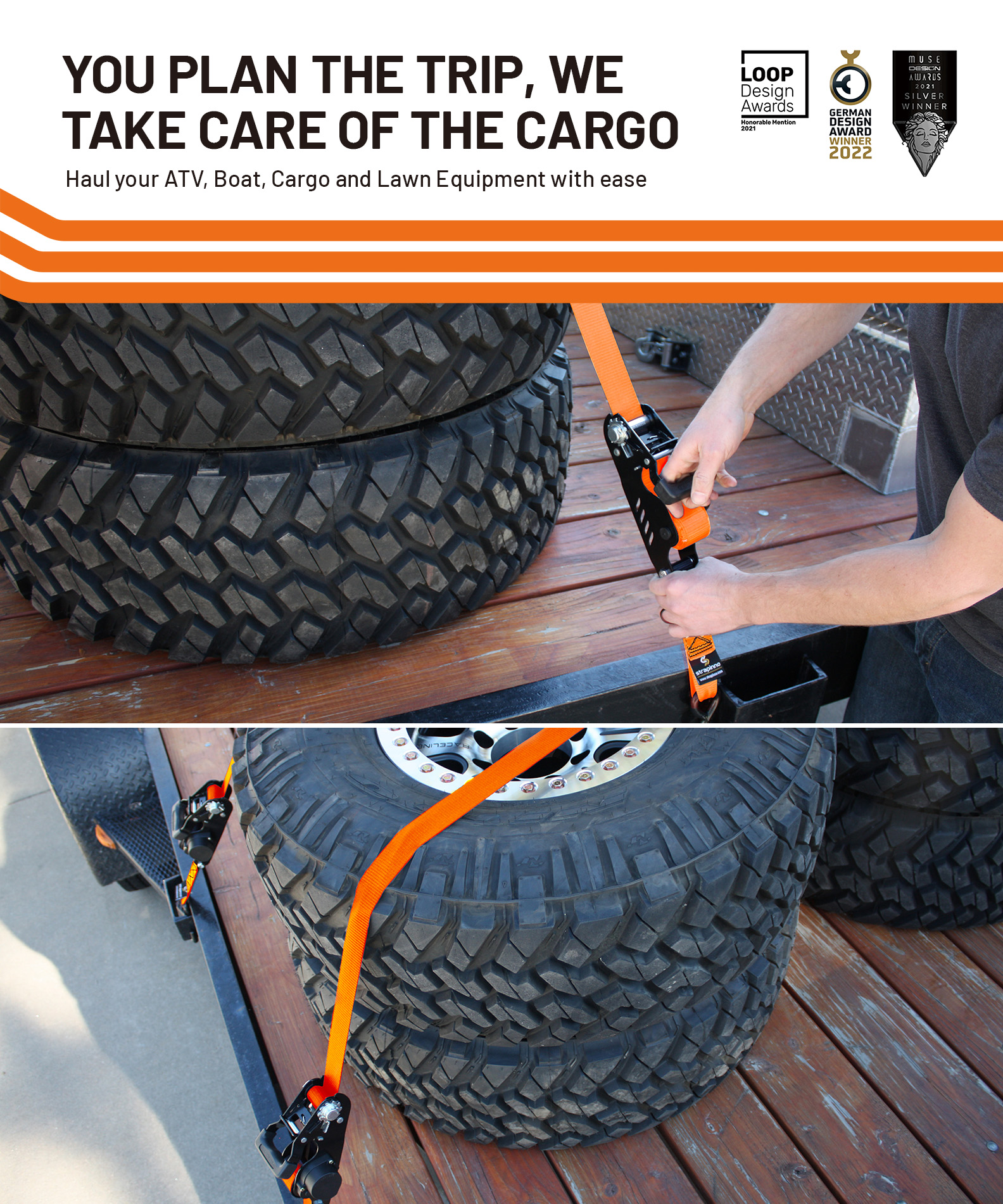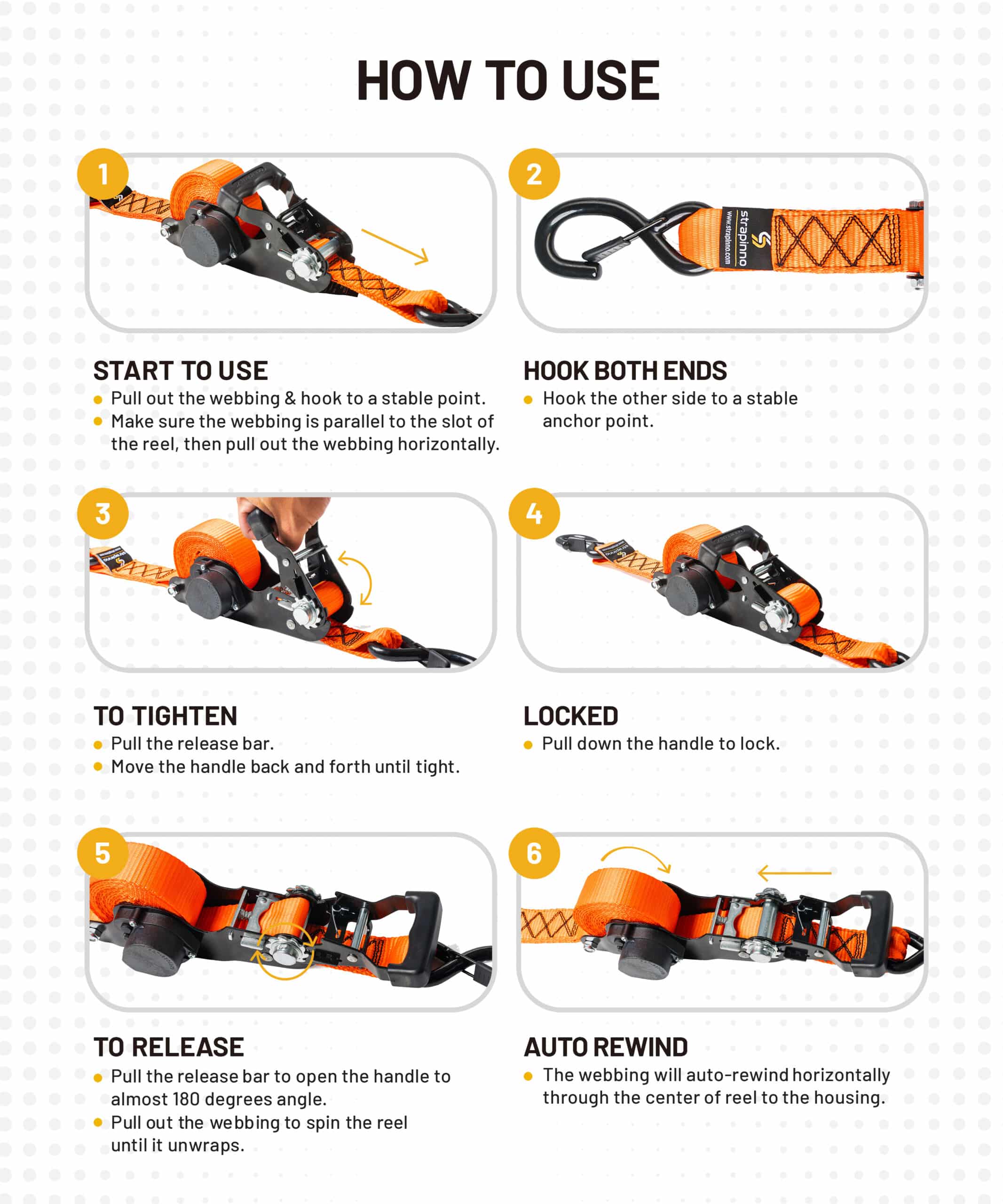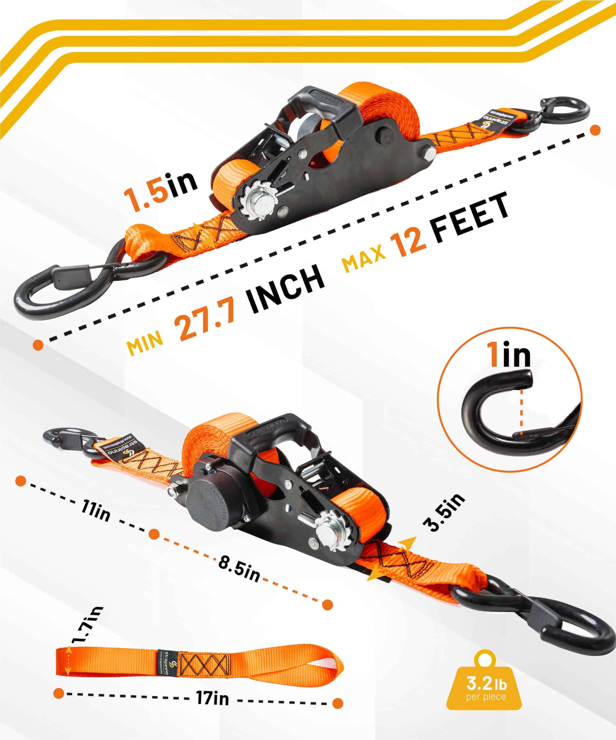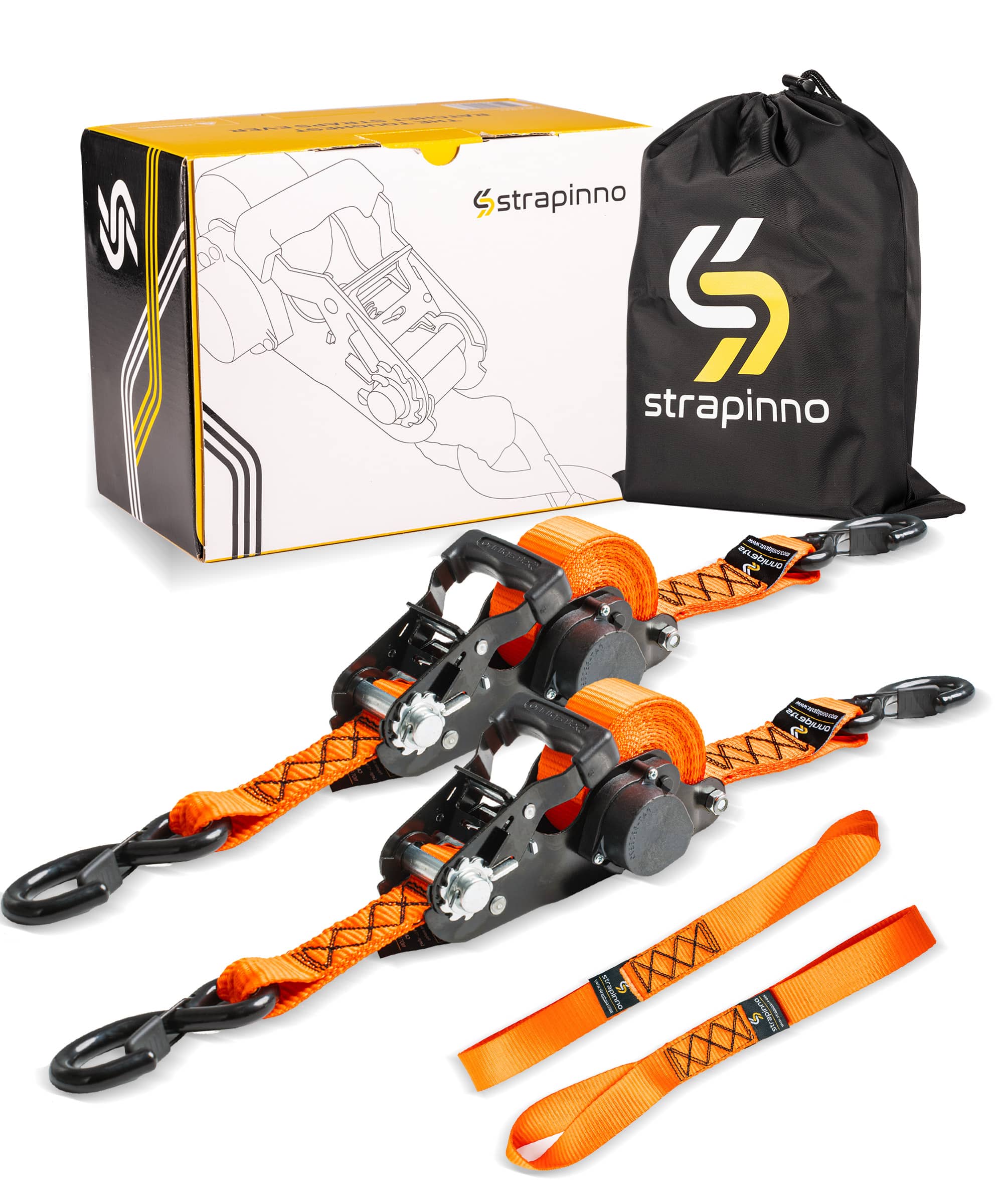 Strapinno’s ratchet straps come in one piece, ready to use anytime, with no assembly. User-friendly, simply open the handle and hook both ends. Haul away. That’s it!