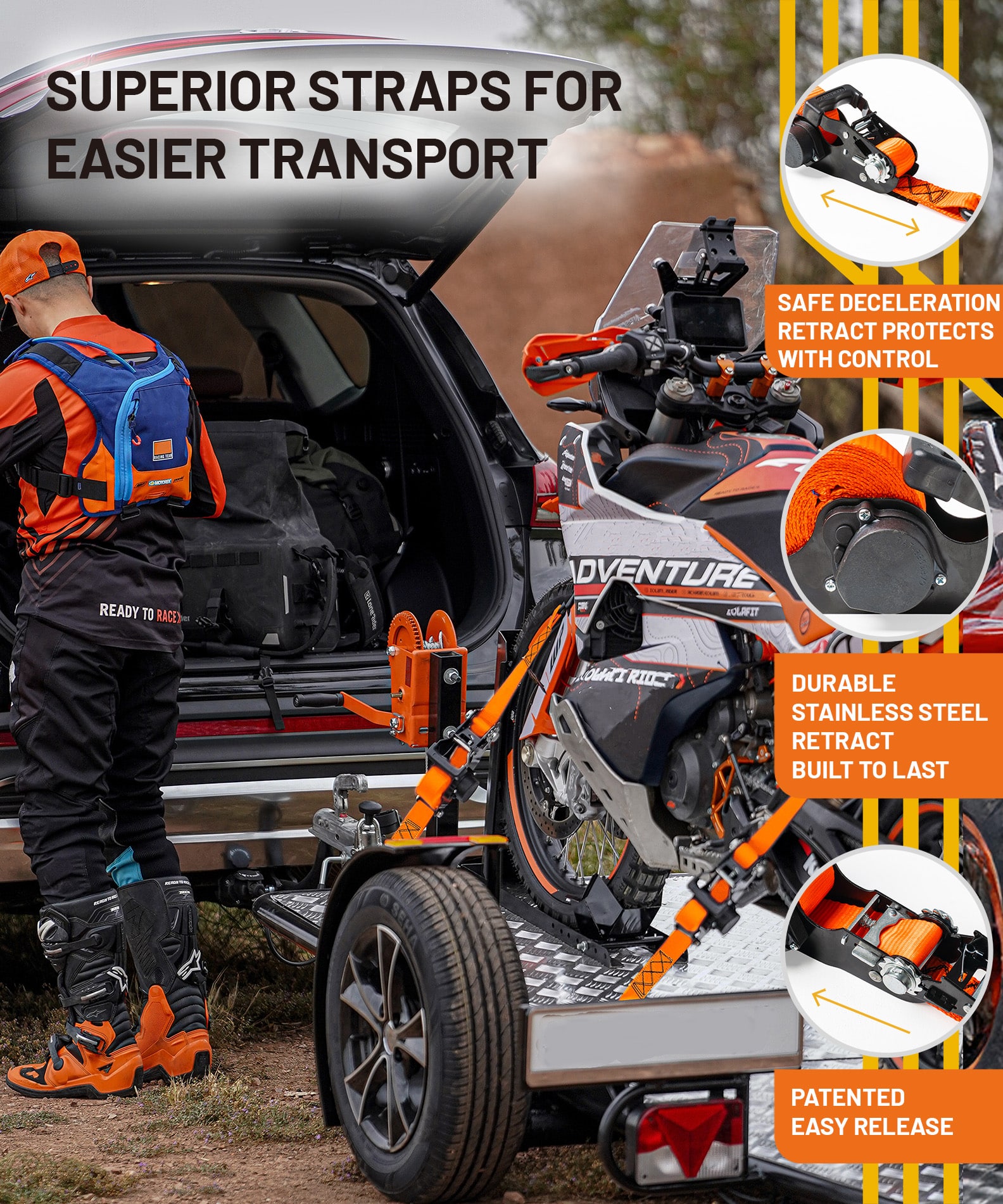With stainless steel auto-retract system, you won’t have to deal with any excess strap or tail flapping in the wind. The easy-release design makes unloading effortless and quick.