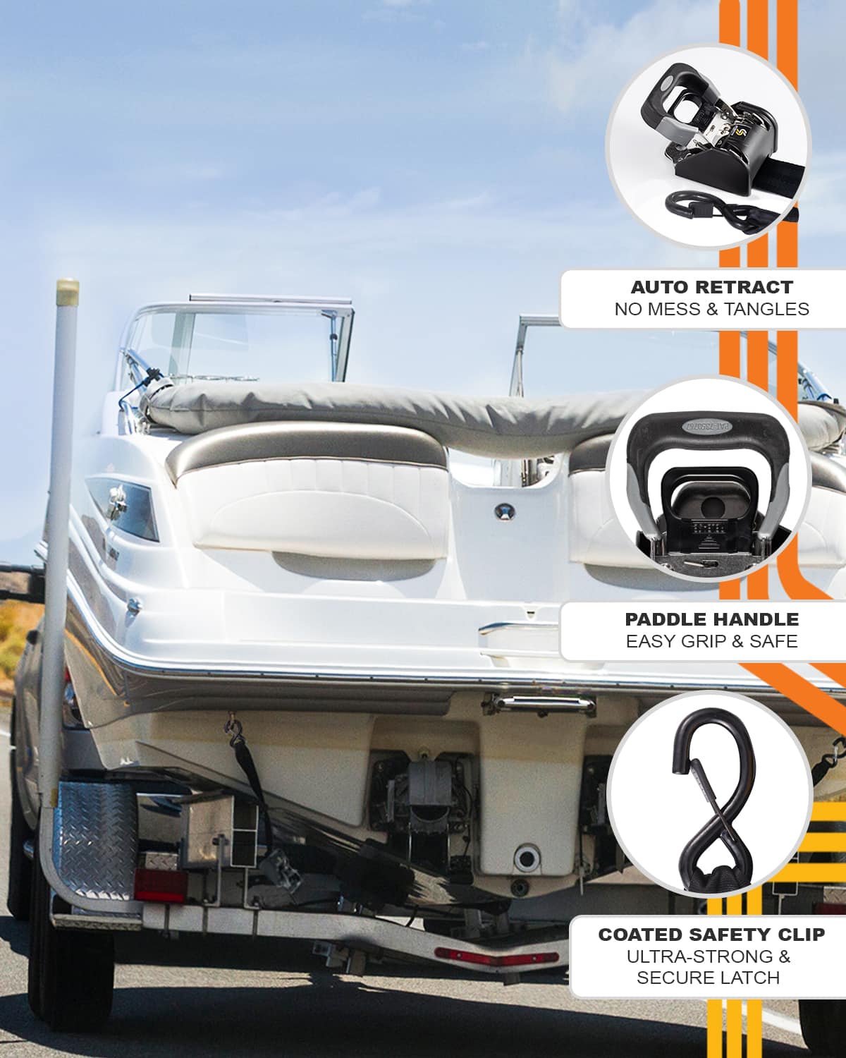 Keep boats and other power watercraft safely secured on your trailer with durable straps that’ll keep them in place. Releasing them is incredibly simple, too!